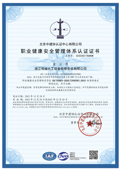 职业健康安全管理体系认证证书